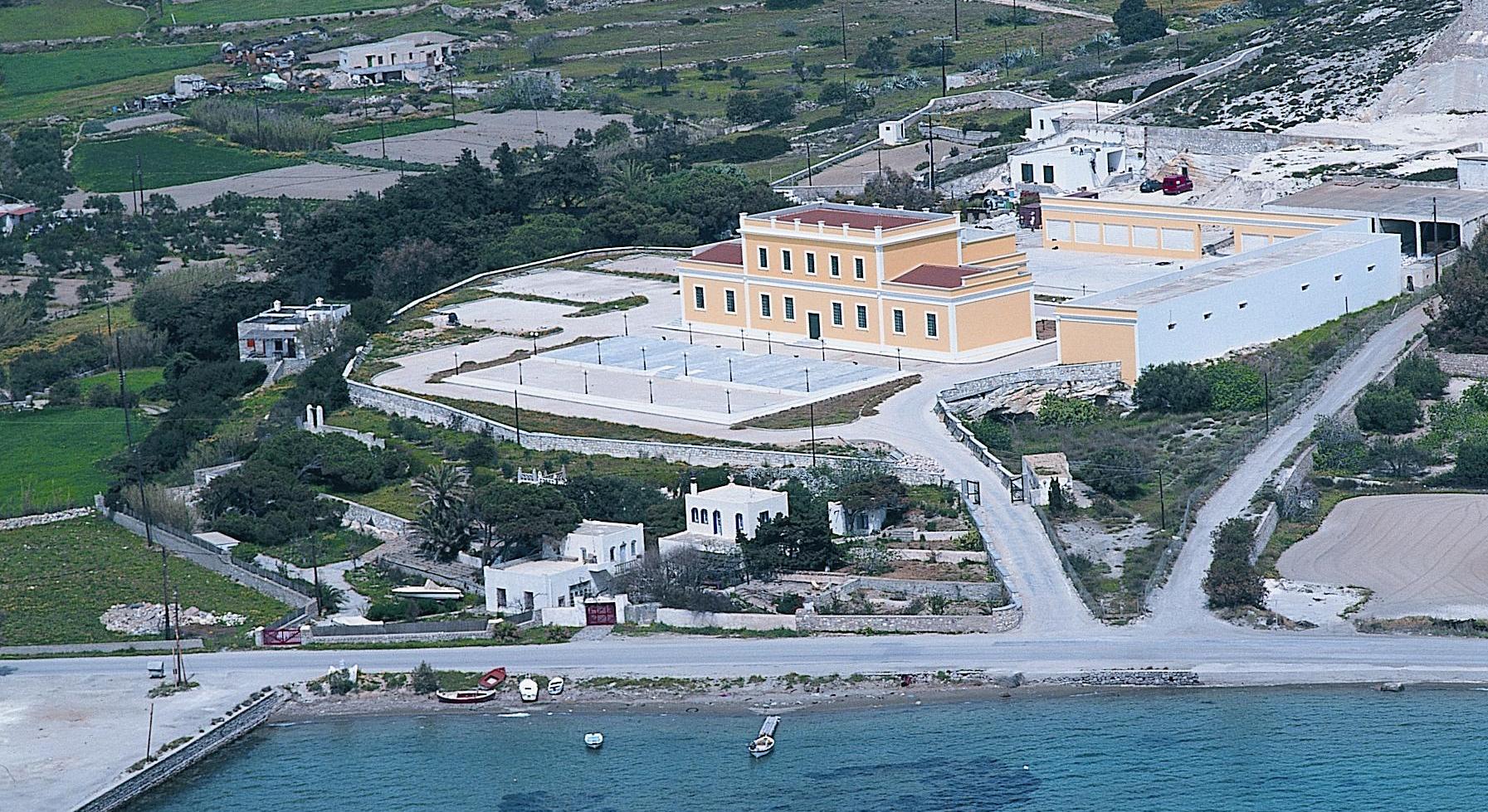 Το κτήριο στο οποίο στεγάζεται, και το οποίο δεσπόζει του κόλπου της Μήλου, ήταν ένα παλιό εργοστάσιο κατεργασίας καολίνη, που αναστηλώθηκε για το σκοπό αυτό. Η κατασκευή του εργοστασίου τοποθετείται στο 1925. Πρόκειται για ένα θαυμάσιο δείγμα βιομηχανικής αρχιτεκτονικής του μεσοπολέμου, το οποίο όμως είχε αρχίσει να καταρρέει λόγω εγκαταλείψεως πριν περάσει στην ιδιοκτησία της ΟΡΥΜΗΛ Α.Ε., εταιρία η οποία ανήκει στην κα Καίτη Κυριακοπούλου. Tο ερείπιο αναστηλώθηκε με υψηλής αισθητικής κριτήρια και σεβασμό στην αρχική του αρχιτεκτονική.